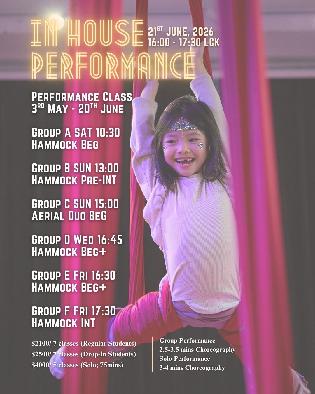 Our In-House Performance Showcase is a guided performance program designed to help students turn their aerial skills into a polished routine. Over a structured training period, students learn choreography, musicality, clean technique, smooth transitions, and stage confidence—then celebrate their progress in a supportive studio showcase.